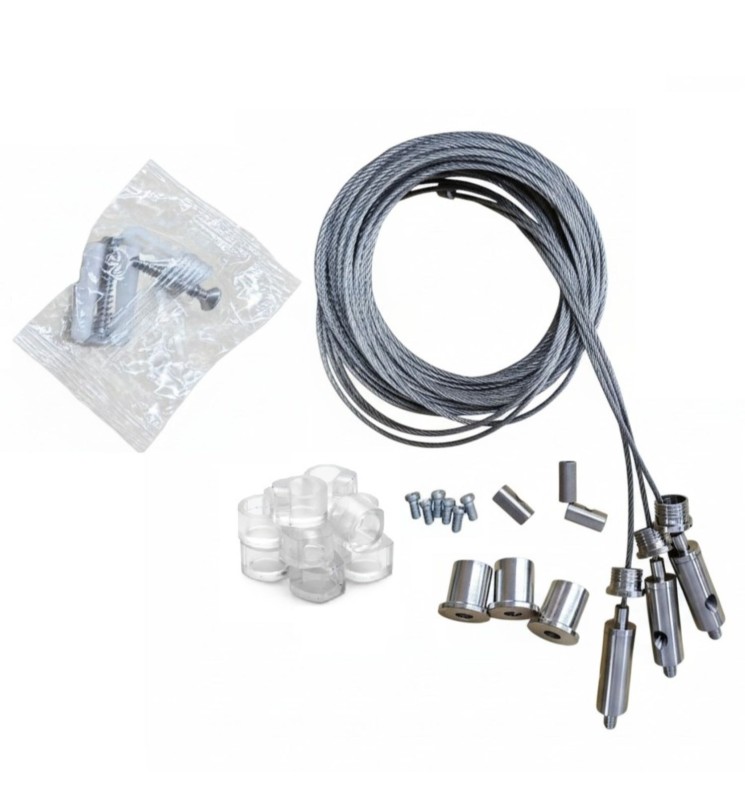 Inclus : 3 filins en aciers de 3m, 3 supports plafond à visser et 8 serre-câbles transparents.
